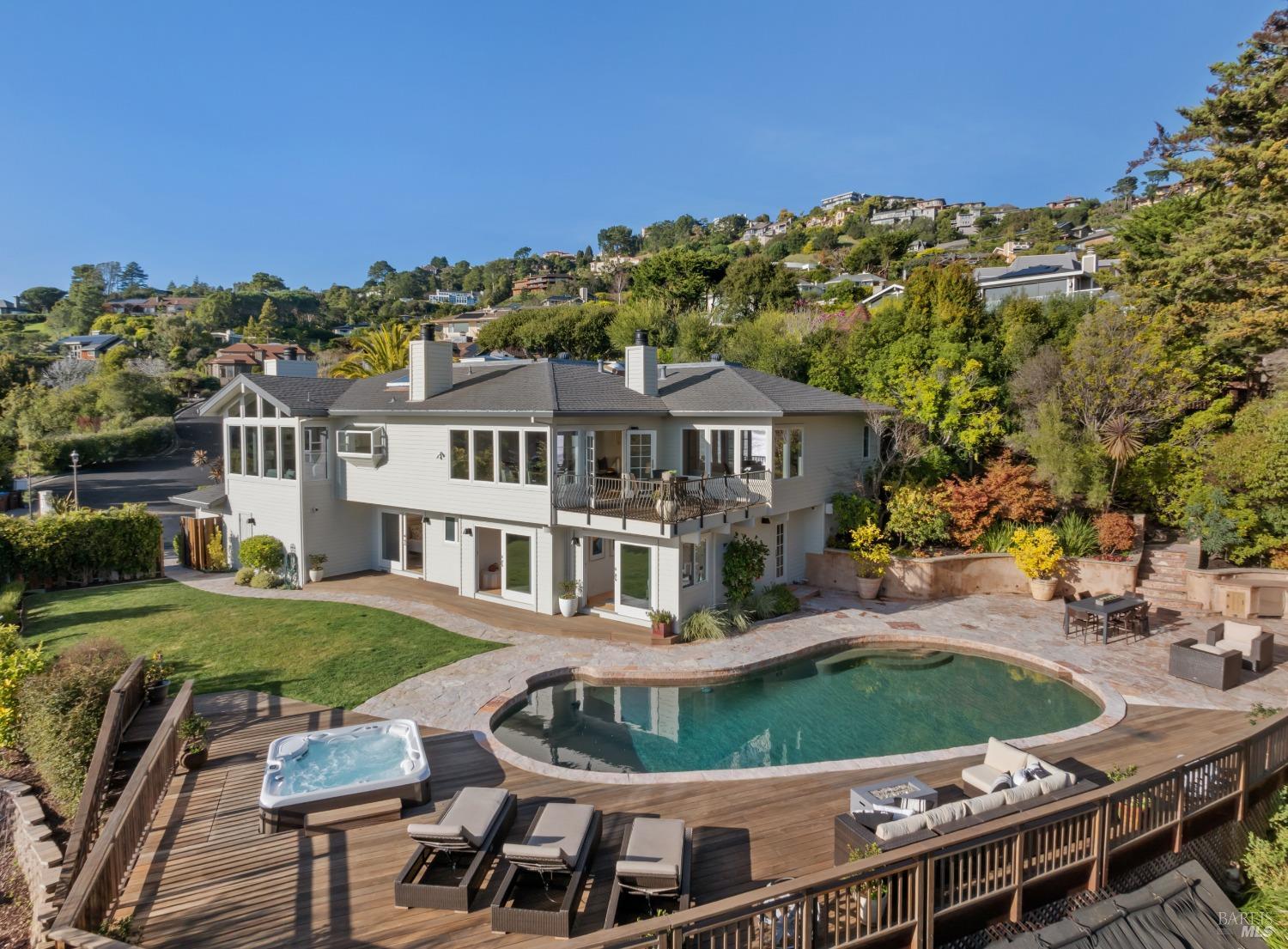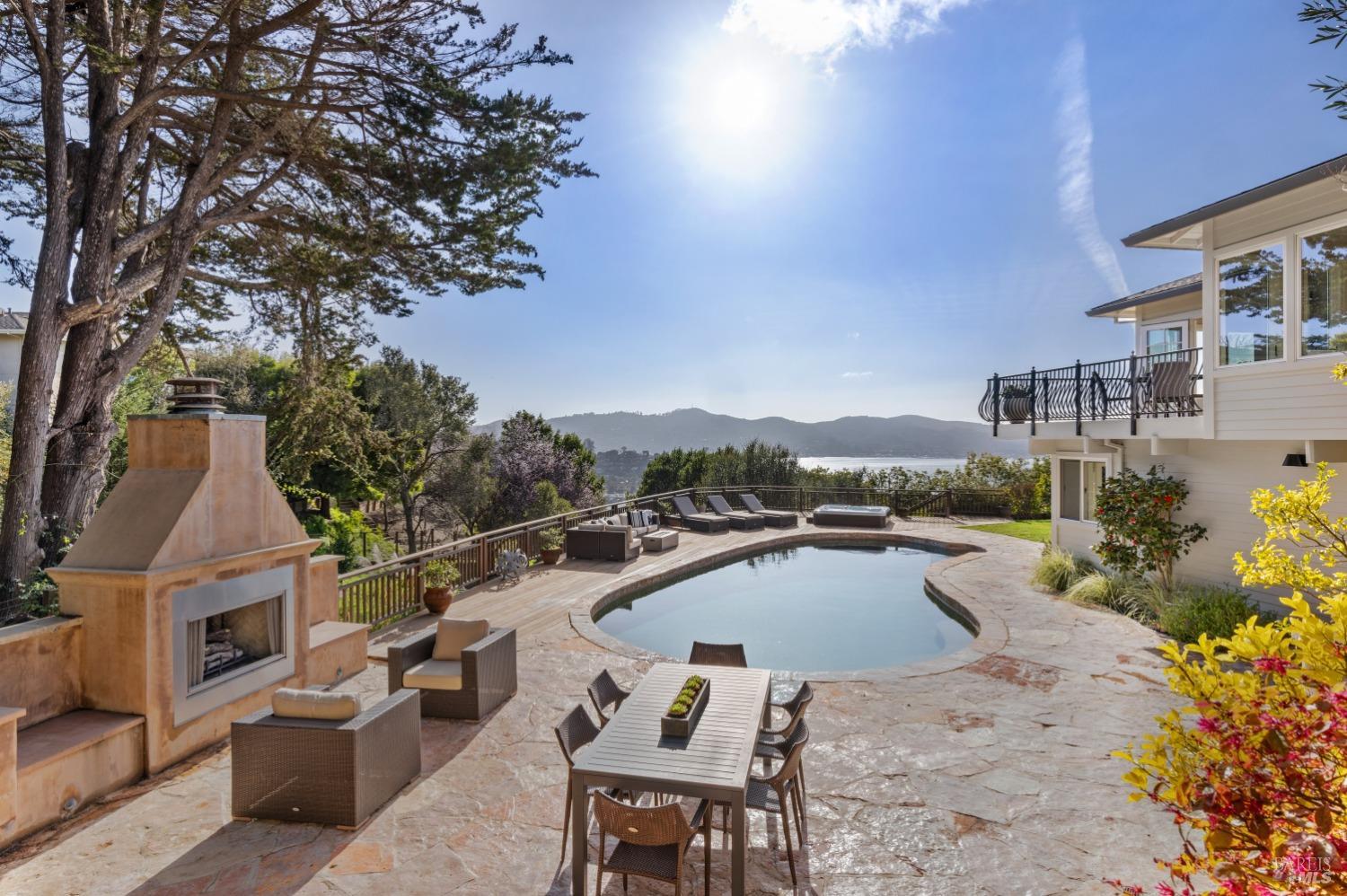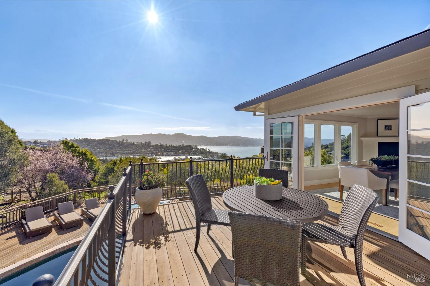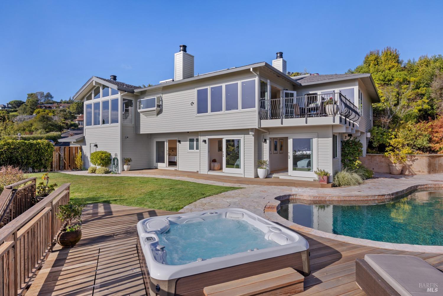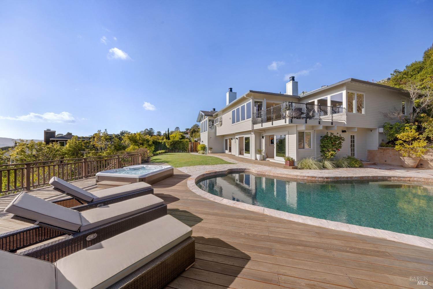 Nestled in one of Tiburon's best neighborhoods, this exquisite 4-bedroom, 2.5-bath contemporary residence offers the perfect blend of luxury, comfort, and natural beauty. Enjoy sweeping panoramic views of Richardson Bay Belvedere Island and Lagoon, and the iconic Golden Gate Bridge from this sanctuary. Ideal for both sophisticated living and entertaining, the main level offers a functional floorplan that flows from the formal living room and office to the spacious kitchen, dining/family combo room. Sliding doors open from this space to an entertaining deck, great for al fresco dining and relaxation, as you take in the inspiring vistas. Expansive windows frame the stunning south-facing views and invite abundant natural light, creating a relaxing atmosphere. The kitchen is well appointed and spacious, featuring high-end appliances, sleek finishes, and a great space for both cooking and entertaining. The primary suite offers a private retreat w/ picturesque views, a spacious spa-like en-suite bathroom with dual vanities, a soaking tub, a separate shower and a roomy walk-in closet. On the lower level, you'll find three generous bedrooms and a shared bathroom. Amazing pool/spa terrace w/outdoor kitchen BBQ and flat, grassy yard and orchard. Large 2 Car garage and driveway parking.
