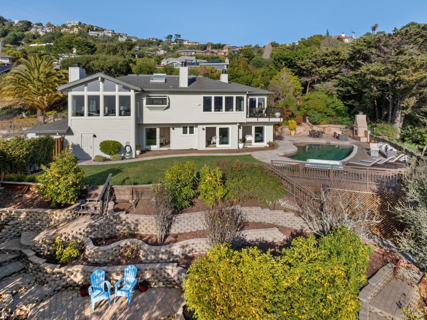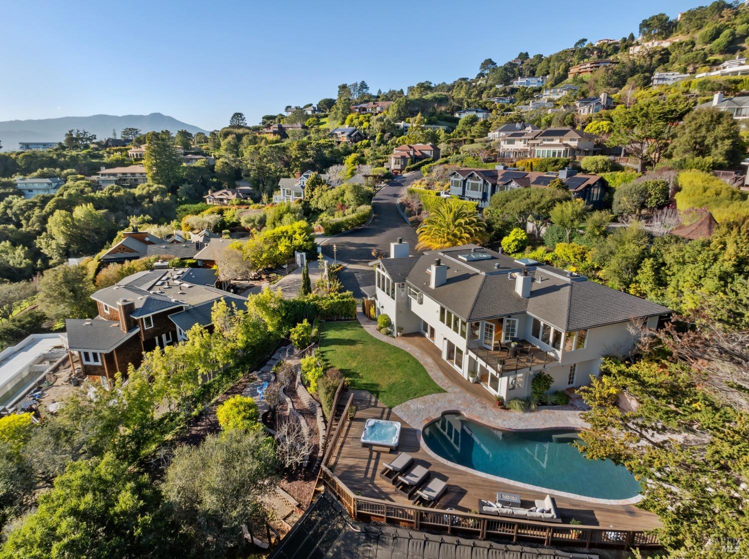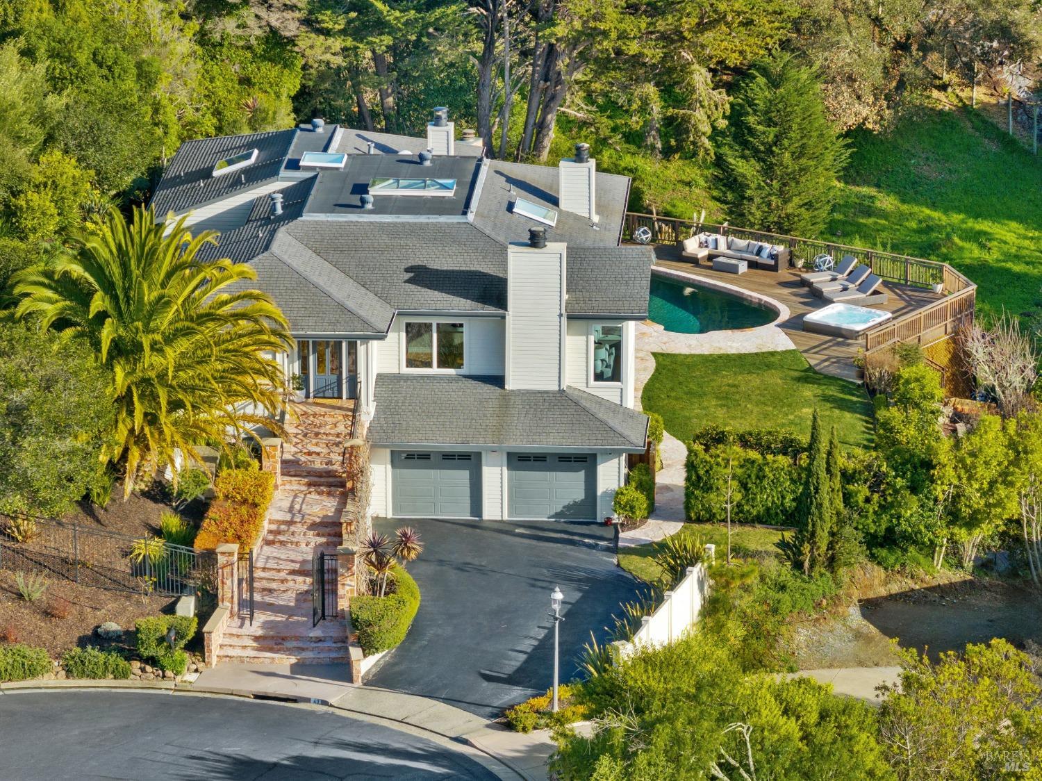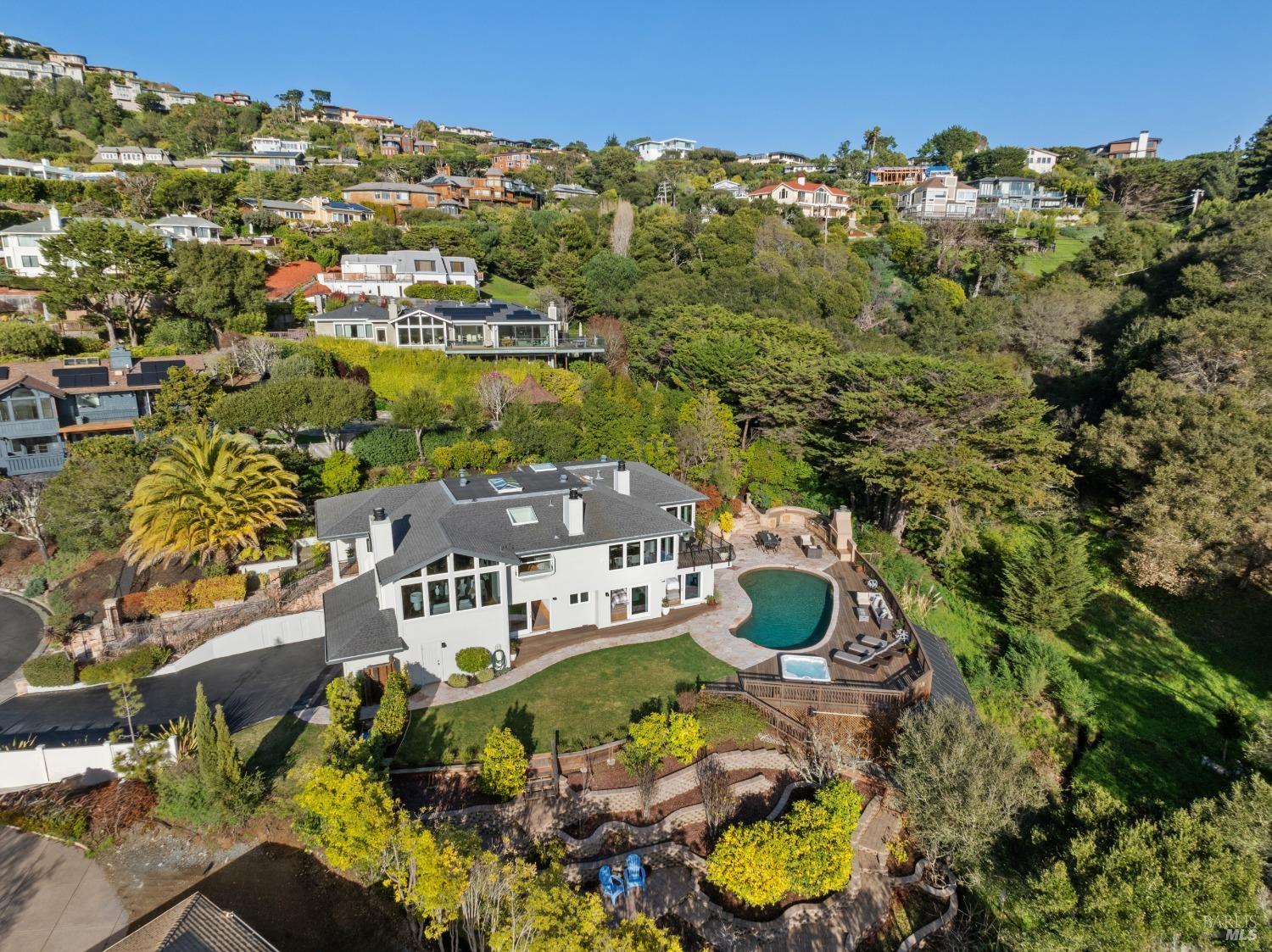 Nestled in one of Tiburon's best neighborhoods, this exquisite 4-bedroom, 2.5-bath contemporary residence offers the perfect blend of luxury, comfort, and natural beauty. Enjoy sweeping panoramic views of Richardson Bay Belvedere Island and Lagoon, and the iconic Golden Gate Bridge from this sanctuary. Ideal for both sophisticated living and entertaining, the main level offers a functional floorplan that flows from the formal living room and office to the spacious kitchen, dining/family combo room. Sliding doors open from this space to an entertaining deck, great for al fresco dining and relaxation, as you take in the inspiring vistas. Expansive windows frame the stunning south-facing views and invite abundant natural light, creating a relaxing atmosphere. The kitchen is well appointed and spacious, featuring high-end appliances, sleek finishes, and a great space for both cooking and entertaining. The primary suite offers a private retreat w/ picturesque views, a spacious spa-like en-suite bathroom with dual vanities, a soaking tub, a separate shower and a roomy walk-in closet. On the lower level, you'll find three generous bedrooms and a shared bathroom. Amazing pool/spa terrace w/outdoor kitchen BBQ and flat, grassy yard and orchard. Large 2 Car garage and driveway parking.