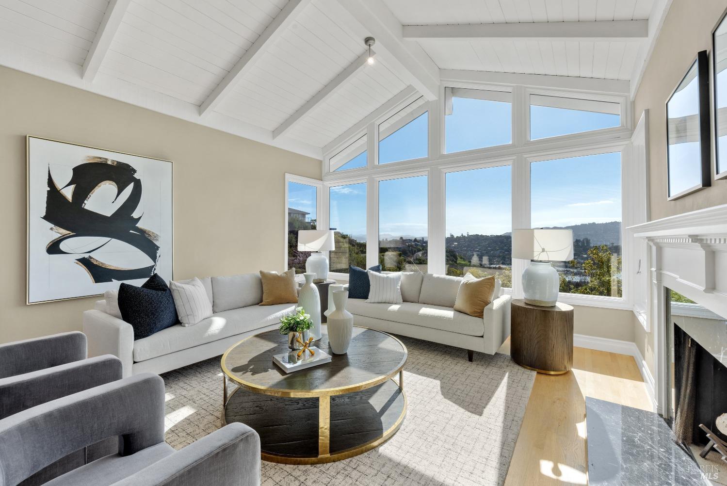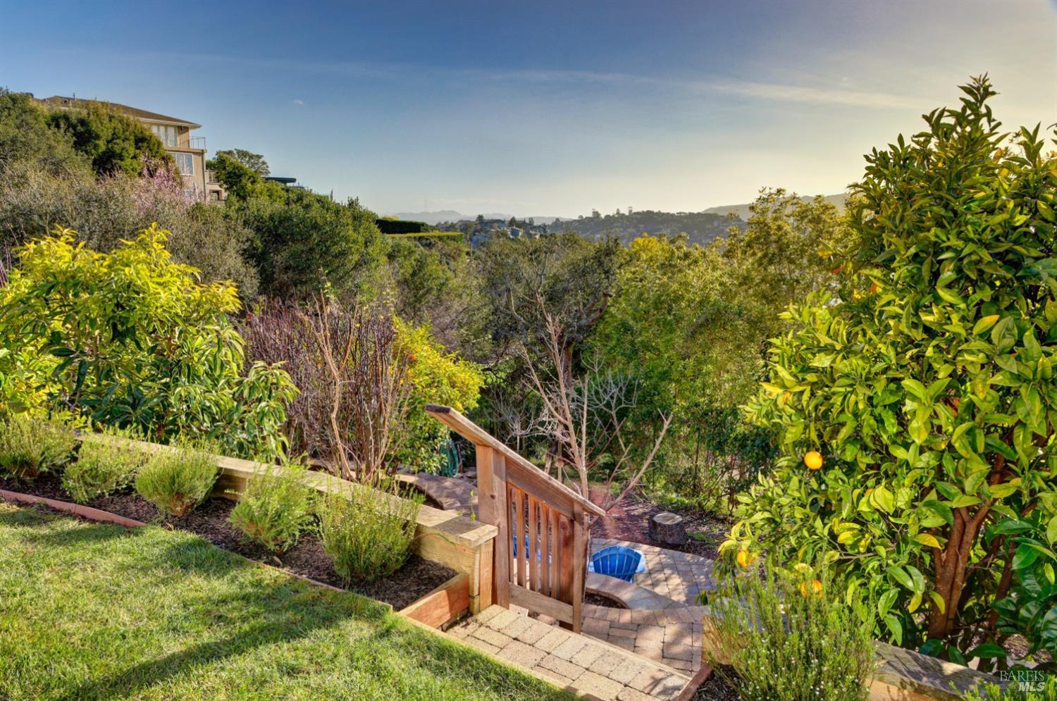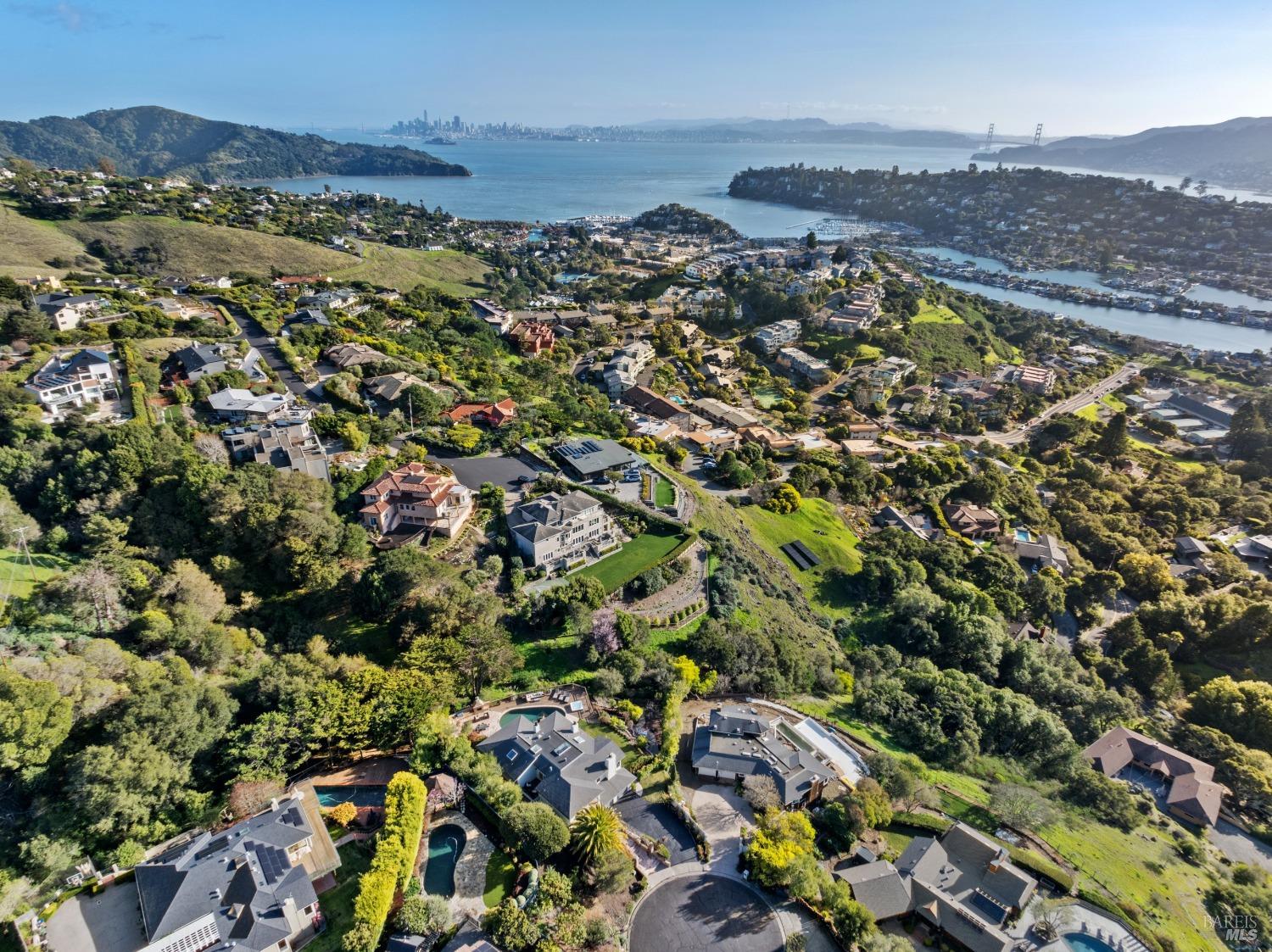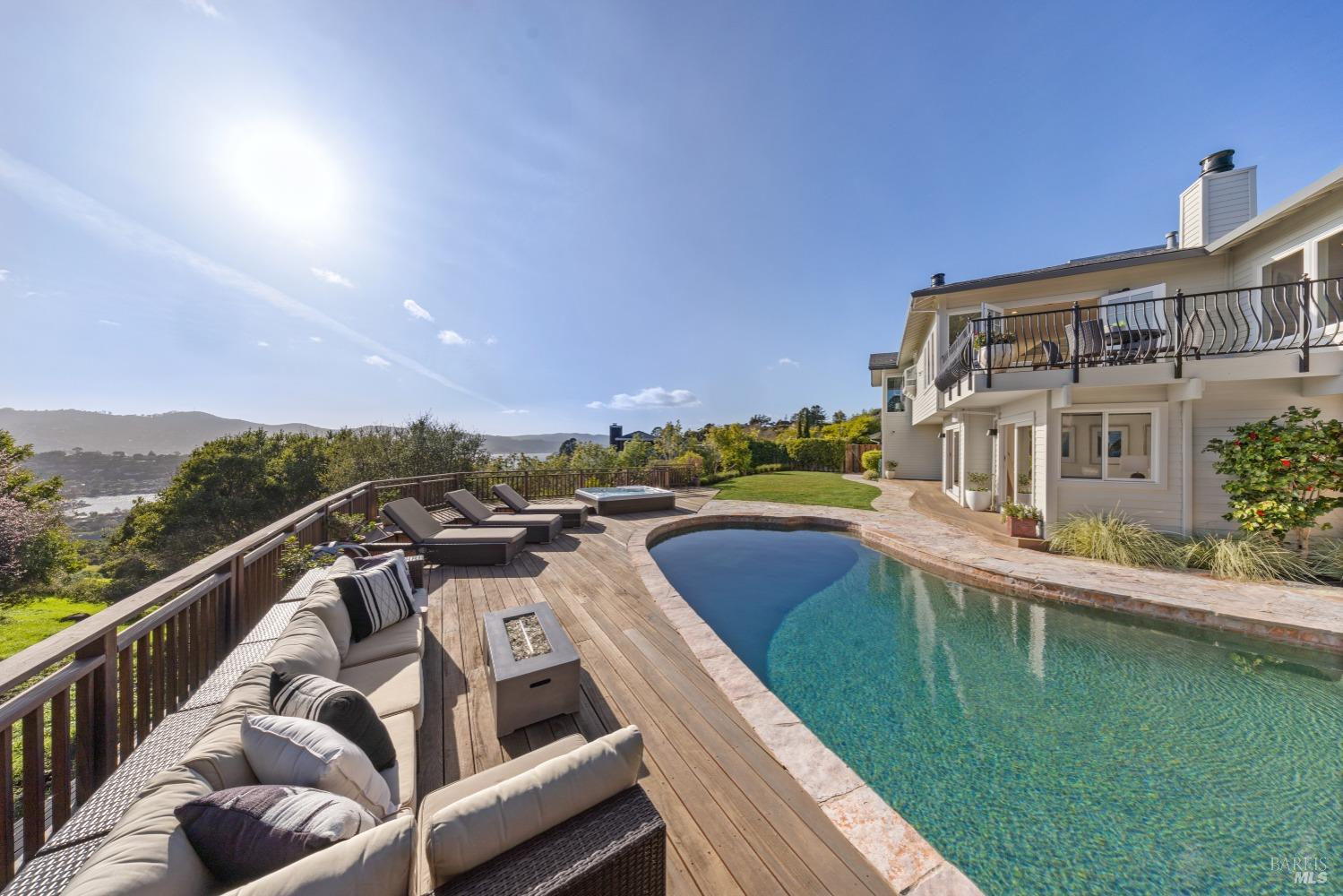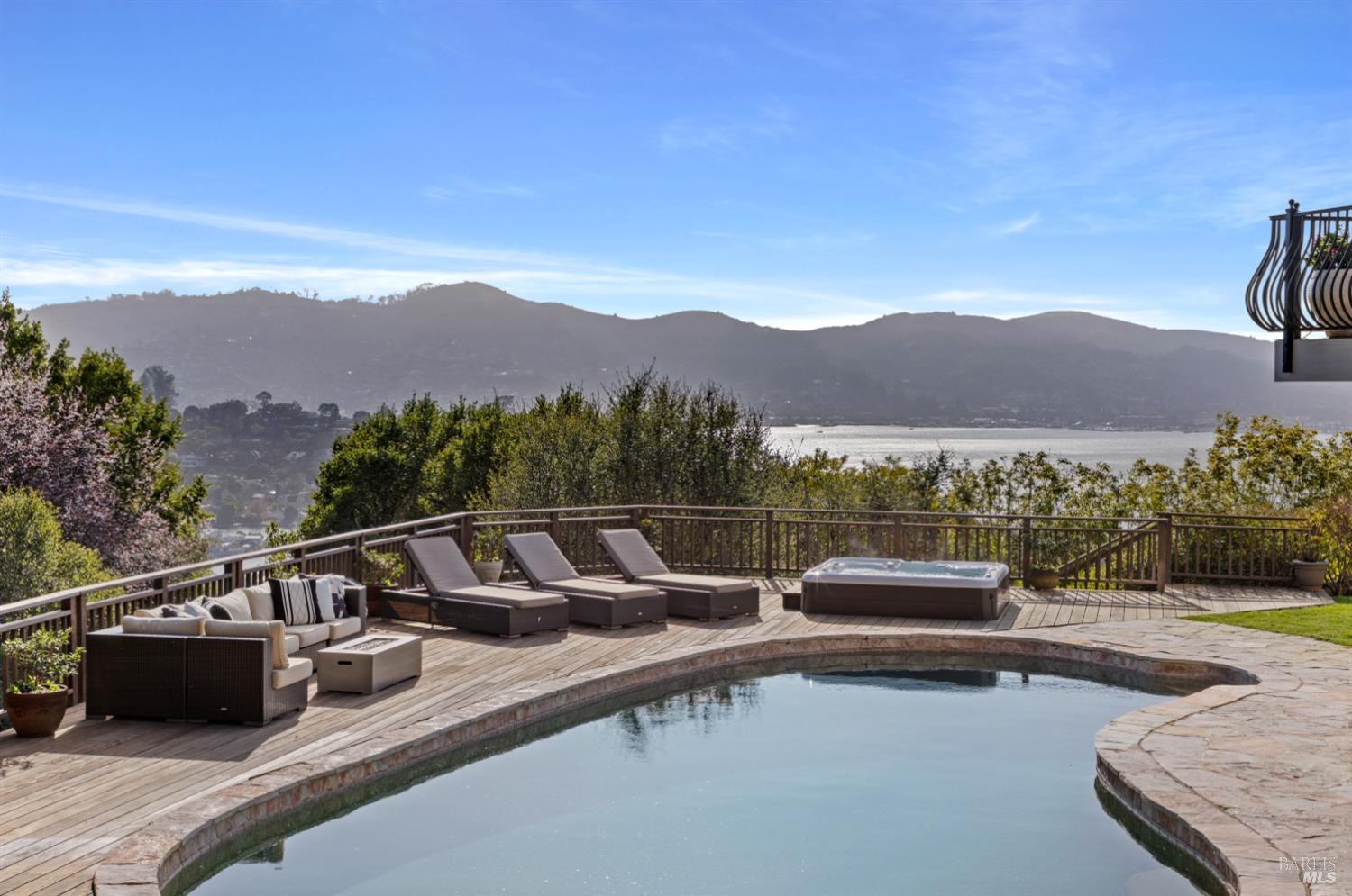 Nestled in one of Tiburon's best neighborhoods, this exquisite 4-bedroom, 2.5-bath contemporary residence offers the perfect blend of luxury, comfort, and natural beauty. Enjoy sweeping panoramic views of Richardson Bay Belvedere Island and Lagoon, and the iconic Golden Gate Bridge from this sanctuary. Ideal for both sophisticated living and entertaining, the main level offers a functional floorplan that flows from the formal living room and office to the spacious kitchen, dining/family combo room. Sliding doors open from this space to an entertaining deck, great for al fresco dining and relaxation, as you take in the inspiring vistas. Expansive windows frame the stunning south-facing views and invite abundant natural light, creating a relaxing atmosphere. The kitchen is well appointed and spacious, featuring high-end appliances, sleek finishes, and a great space for both cooking and entertaining. The primary suite offers a private retreat w/ picturesque views, a spacious spa-like en-suite bathroom with dual vanities, a soaking tub, a separate shower and a roomy walk-in closet. On the lower level, you'll find three generous bedrooms and a shared bathroom. Amazing pool/spa terrace w/outdoor kitchen BBQ and flat, grassy yard and orchard. Large 2 Car garage and driveway parking.