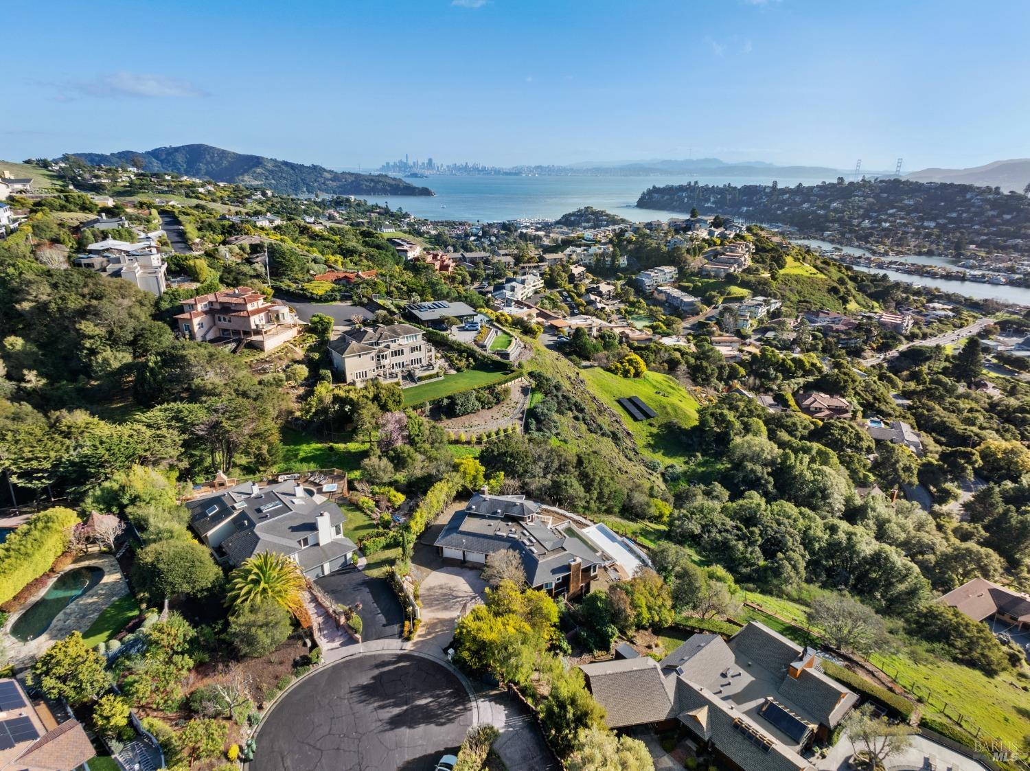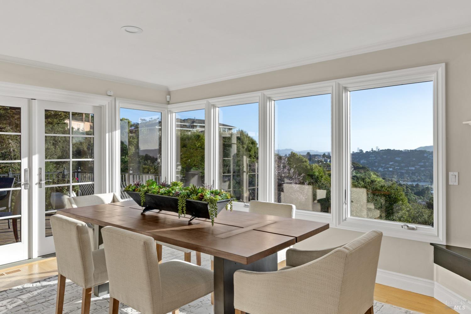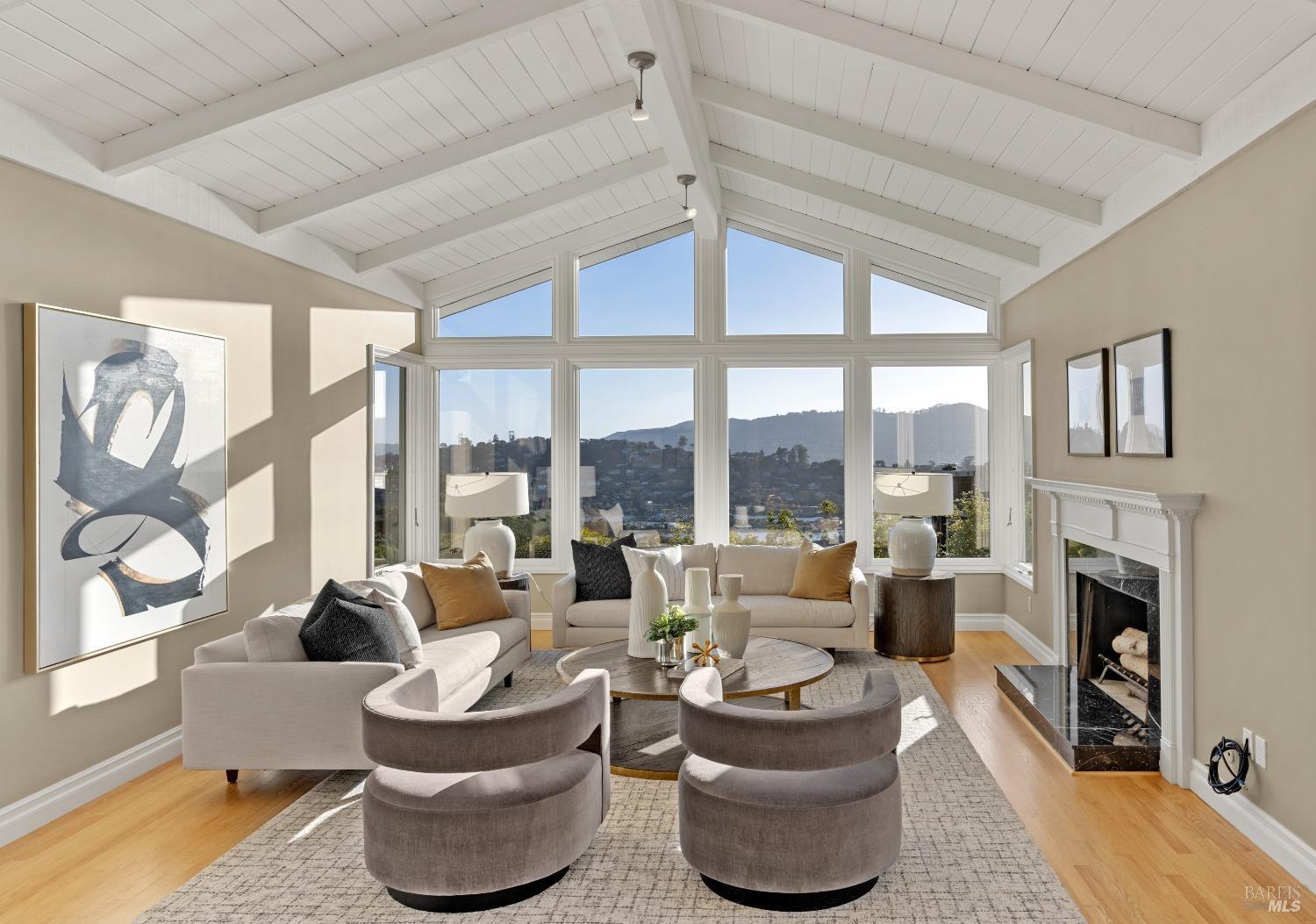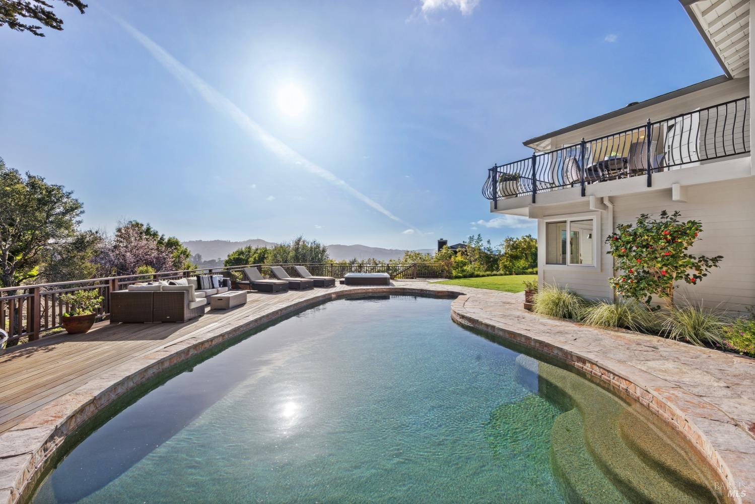 Nestled in one of Tiburon's best neighborhoods, this exquisite 4-bedroom, 2.5-bath contemporary residence offers the perfect blend of luxury, comfort, and natural beauty. Enjoy sweeping panoramic views of Richardson Bay Belvedere Island and Lagoon, and the iconic Golden Gate Bridge from this sanctuary. Ideal for both sophisticated living and entertaining, the main level offers a functional floorplan that flows from the formal living room and office to the spacious kitchen, dining/family combo room. Sliding doors open from this space to an entertaining deck, great for al fresco dining and relaxation, as you take in the inspiring vistas. Expansive windows frame the stunning south-facing views and invite abundant natural light, creating a relaxing atmosphere. The kitchen is well appointed and spacious, featuring high-end appliances, sleek finishes, and a great space for both cooking and entertaining. The primary suite offers a private retreat w/ picturesque views, a spacious spa-like en-suite bathroom with dual vanities, a soaking tub, a separate shower and a roomy walk-in closet. On the lower level, you'll find three generous bedrooms and a shared bathroom. Amazing pool/spa terrace w/outdoor kitchen BBQ and flat, grassy yard and orchard. Large 2 Car garage and driveway parking.