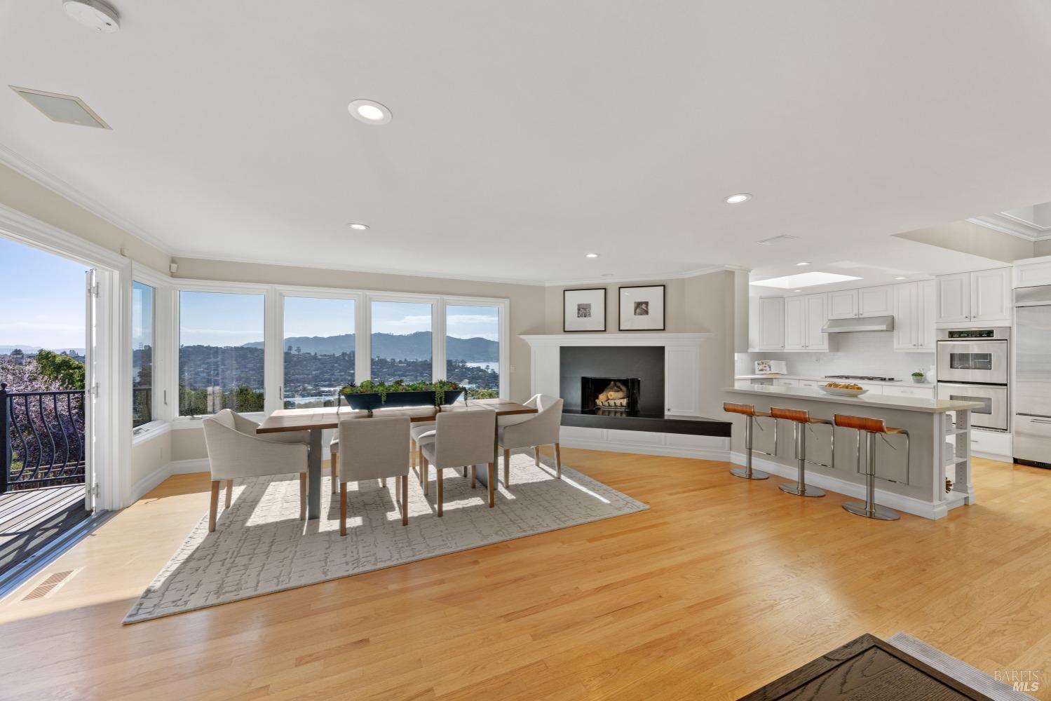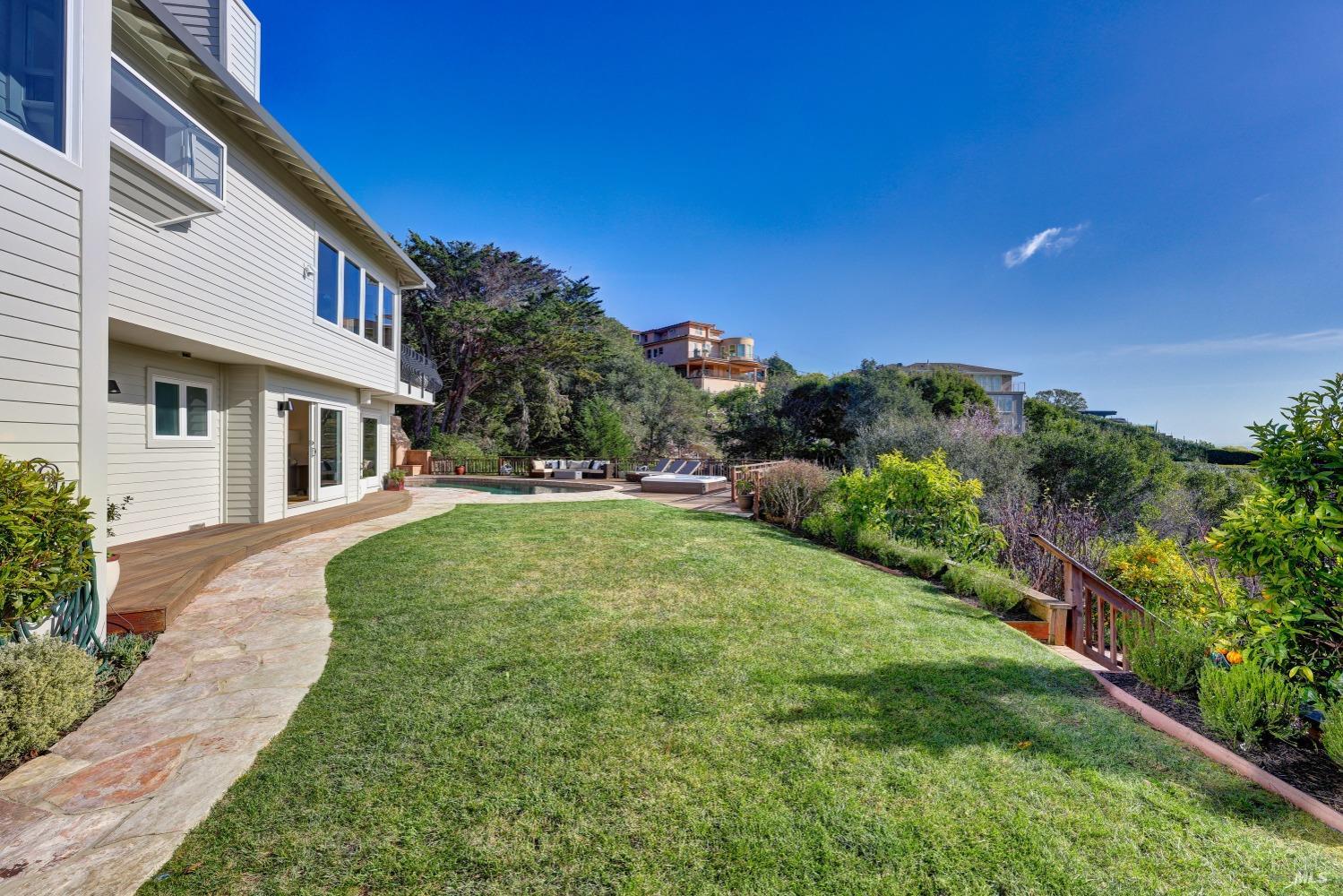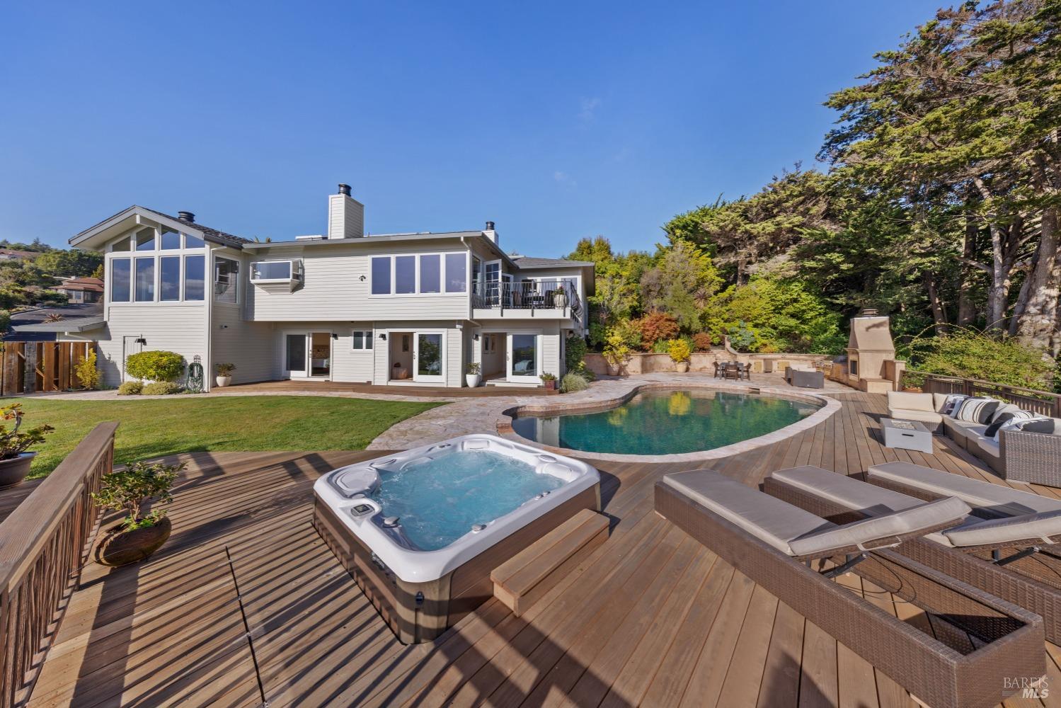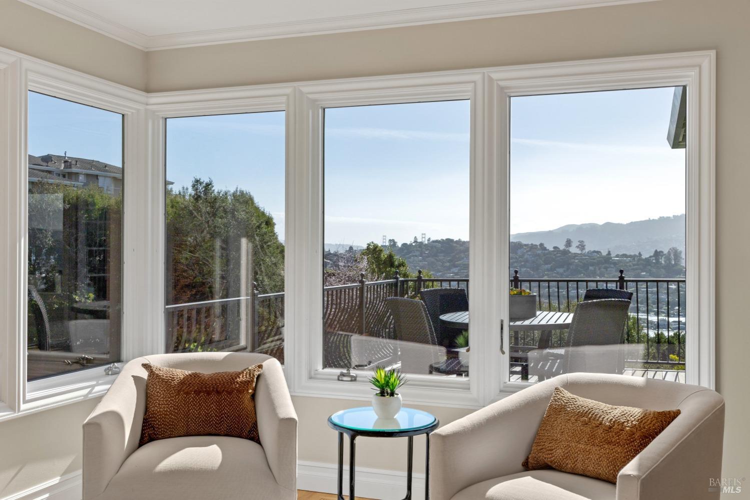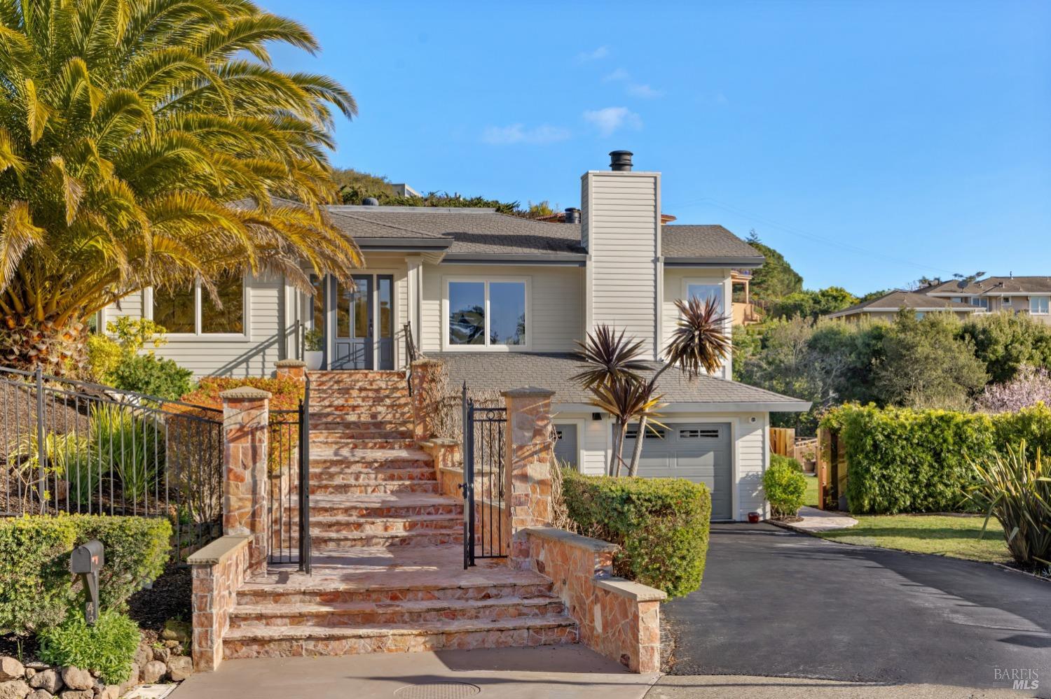Nestled in one of Tiburon's best neighborhoods, this exquisite 4-bedroom, 2.5-bath contemporary residence offers the perfect blend of luxury, comfort, and natural beauty. Enjoy sweeping panoramic views of Richardson Bay Belvedere Island and Lagoon, and the iconic Golden Gate Bridge from this sanctuary. Ideal for both sophisticated living and entertaining, the main level offers a functional floorplan that flows from the formal living room and office to the spacious kitchen, dining/family combo room. Sliding doors open from this space to an entertaining deck, great for al fresco dining and relaxation, as you take in the inspiring vistas. Expansive windows frame the stunning south-facing views and invite abundant natural light, creating a relaxing atmosphere. The kitchen is well appointed and spacious, featuring high-end appliances, sleek finishes, and a great space for both cooking and entertaining. The primary suite offers a private retreat w/ picturesque views, a spacious spa-like en-suite bathroom with dual vanities, a soaking tub, a separate shower and a roomy walk-in closet. On the lower level, you'll find three generous bedrooms and a shared bathroom. Amazing pool/spa terrace w/outdoor kitchen BBQ and flat, grassy yard and orchard. Large 2 Car garage and driveway parking.
