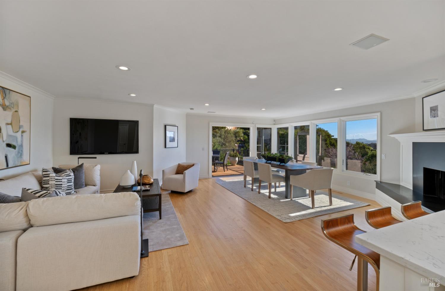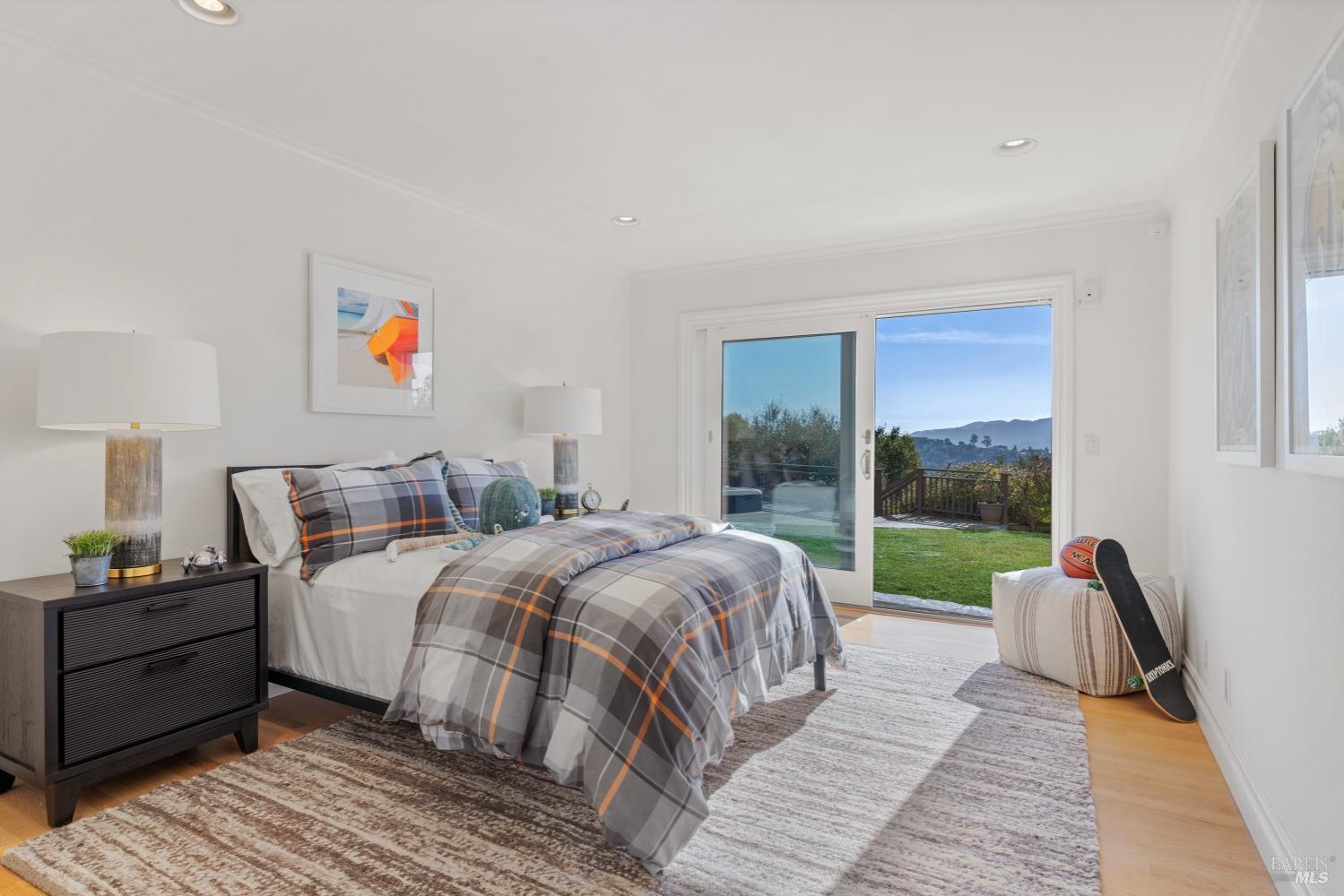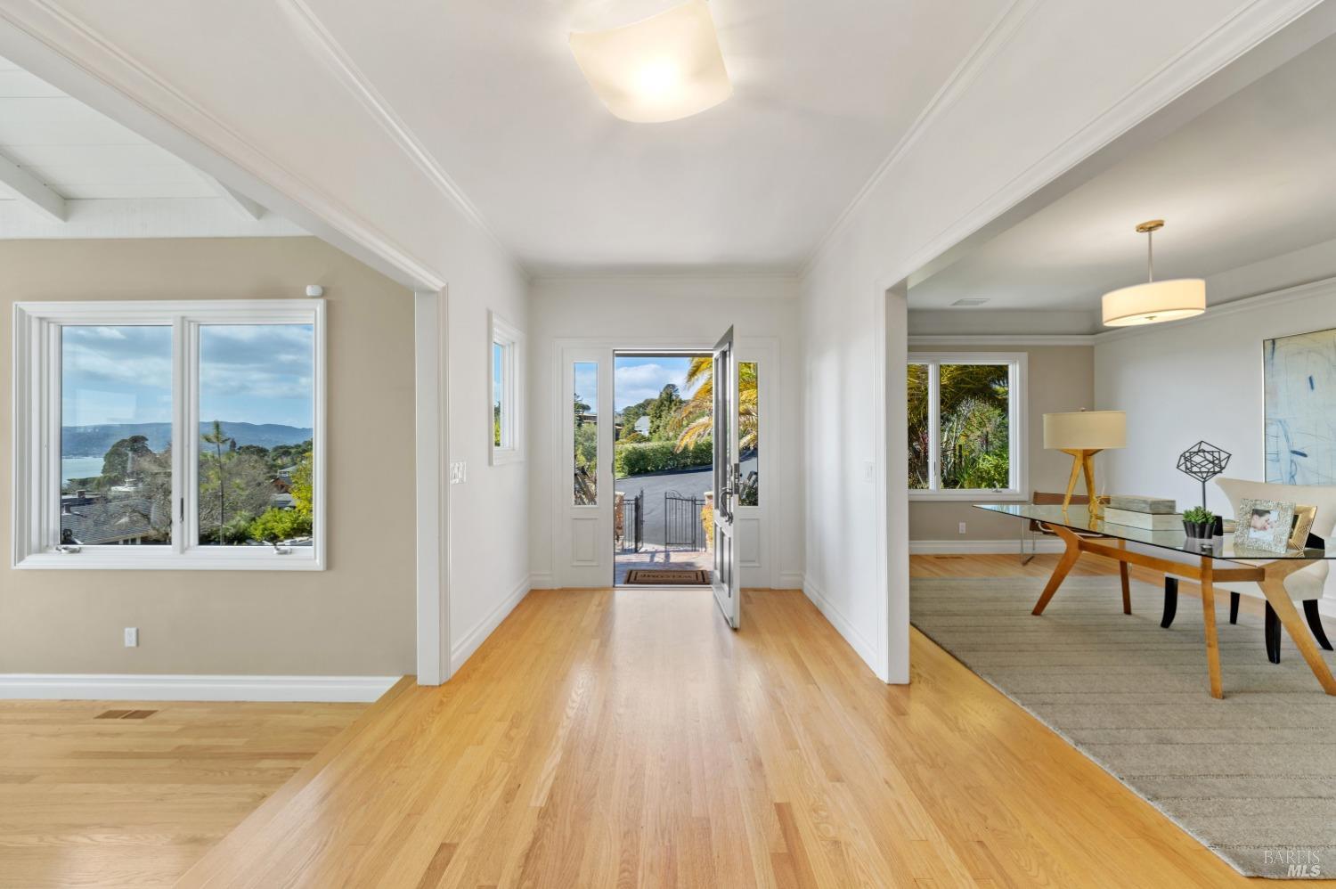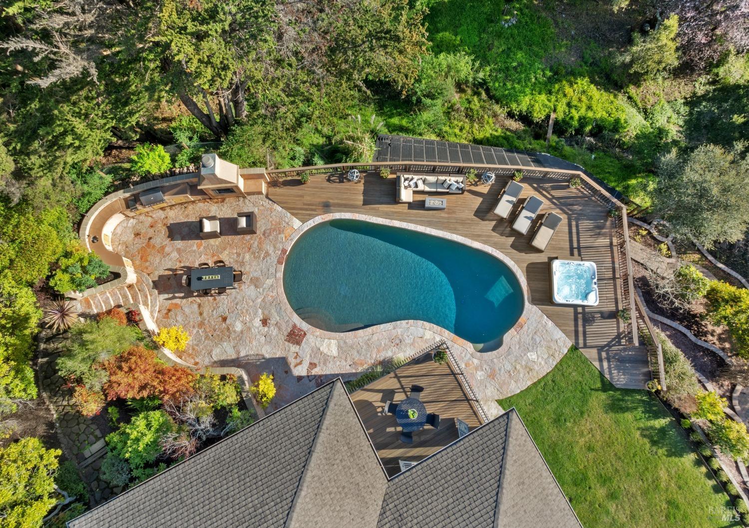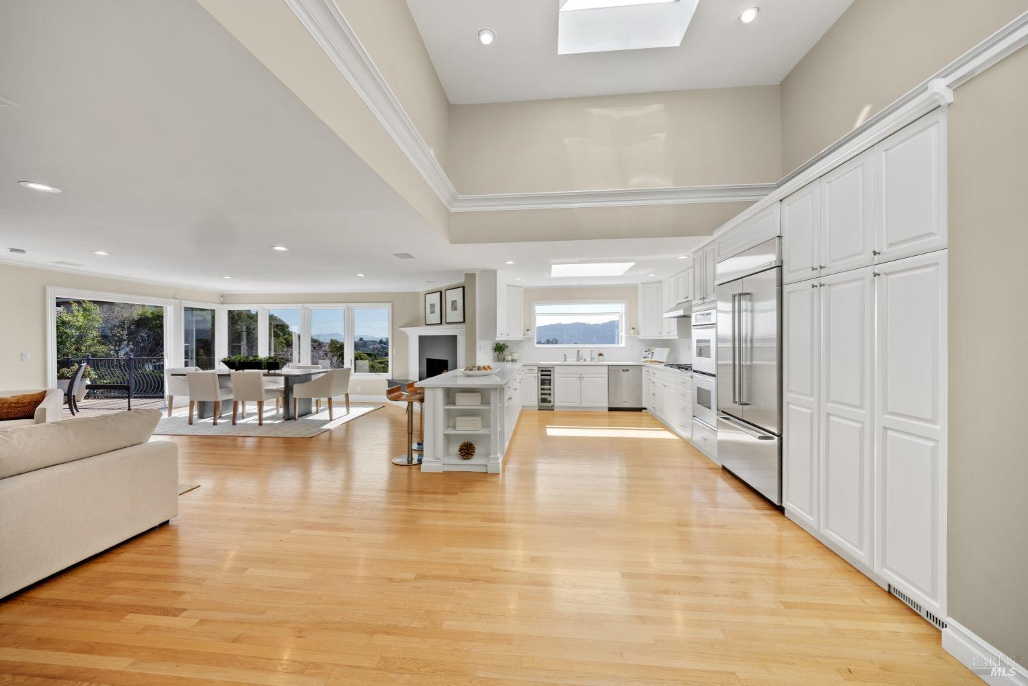 Nestled in one of Tiburon's best neighborhoods, this exquisite 4-bedroom, 2.5-bath contemporary residence offers the perfect blend of luxury, comfort, and natural beauty. Enjoy sweeping panoramic views of Richardson Bay Belvedere Island and Lagoon, and the iconic Golden Gate Bridge from this sanctuary. Ideal for both sophisticated living and entertaining, the main level offers a functional floorplan that flows from the formal living room and office to the spacious kitchen, dining/family combo room. Sliding doors open from this space to an entertaining deck, great for al fresco dining and relaxation, as you take in the inspiring vistas. Expansive windows frame the stunning south-facing views and invite abundant natural light, creating a relaxing atmosphere. The kitchen is well appointed and spacious, featuring high-end appliances, sleek finishes, and a great space for both cooking and entertaining. The primary suite offers a private retreat w/ picturesque views, a spacious spa-like en-suite bathroom with dual vanities, a soaking tub, a separate shower and a roomy walk-in closet. On the lower level, you'll find three generous bedrooms and a shared bathroom. Amazing pool/spa terrace w/outdoor kitchen BBQ and flat, grassy yard and orchard. Large 2 Car garage and driveway parking.
