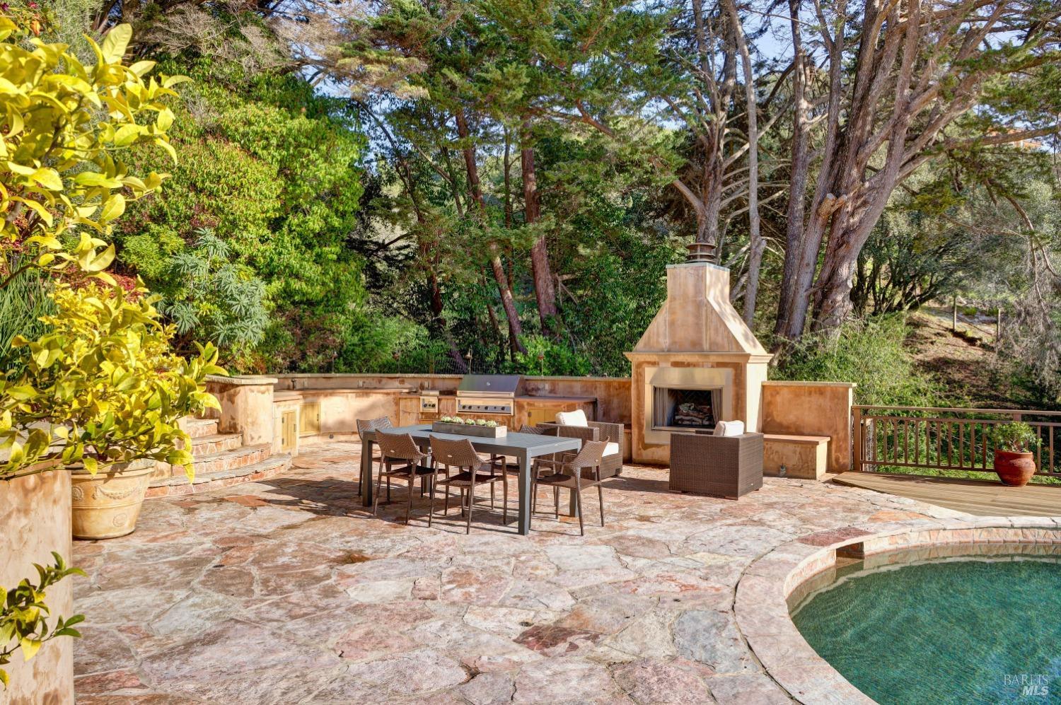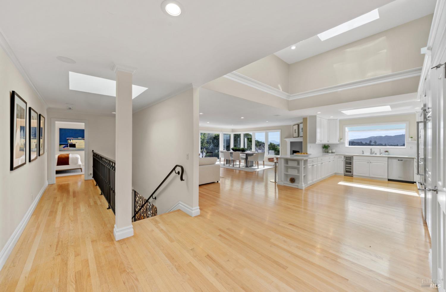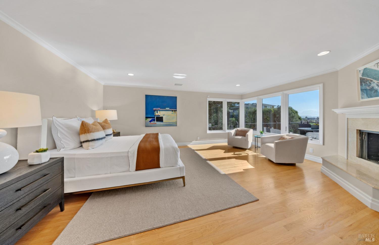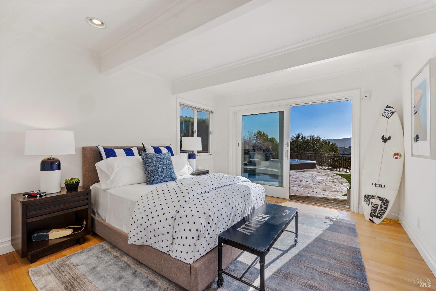 Nestled in one of Tiburon's best neighborhoods, this exquisite 4-bedroom, 2.5-bath contemporary residence offers the perfect blend of luxury, comfort, and natural beauty. Enjoy sweeping panoramic views of Richardson Bay Belvedere Island and Lagoon, and the iconic Golden Gate Bridge from this sanctuary. Ideal for both sophisticated living and entertaining, the main level offers a functional floorplan that flows from the formal living room and office to the spacious kitchen, dining/family combo room. Sliding doors open from this space to an entertaining deck, great for al fresco dining and relaxation, as you take in the inspiring vistas. Expansive windows frame the stunning south-facing views and invite abundant natural light, creating a relaxing atmosphere. The kitchen is well appointed and spacious, featuring high-end appliances, sleek finishes, and a great space for both cooking and entertaining. The primary suite offers a private retreat w/ picturesque views, a spacious spa-like en-suite bathroom with dual vanities, a soaking tub, a separate shower and a roomy walk-in closet. On the lower level, you'll find three generous bedrooms and a shared bathroom. Amazing pool/spa terrace w/outdoor kitchen BBQ and flat, grassy yard and orchard. Large 2 Car garage and driveway parking.