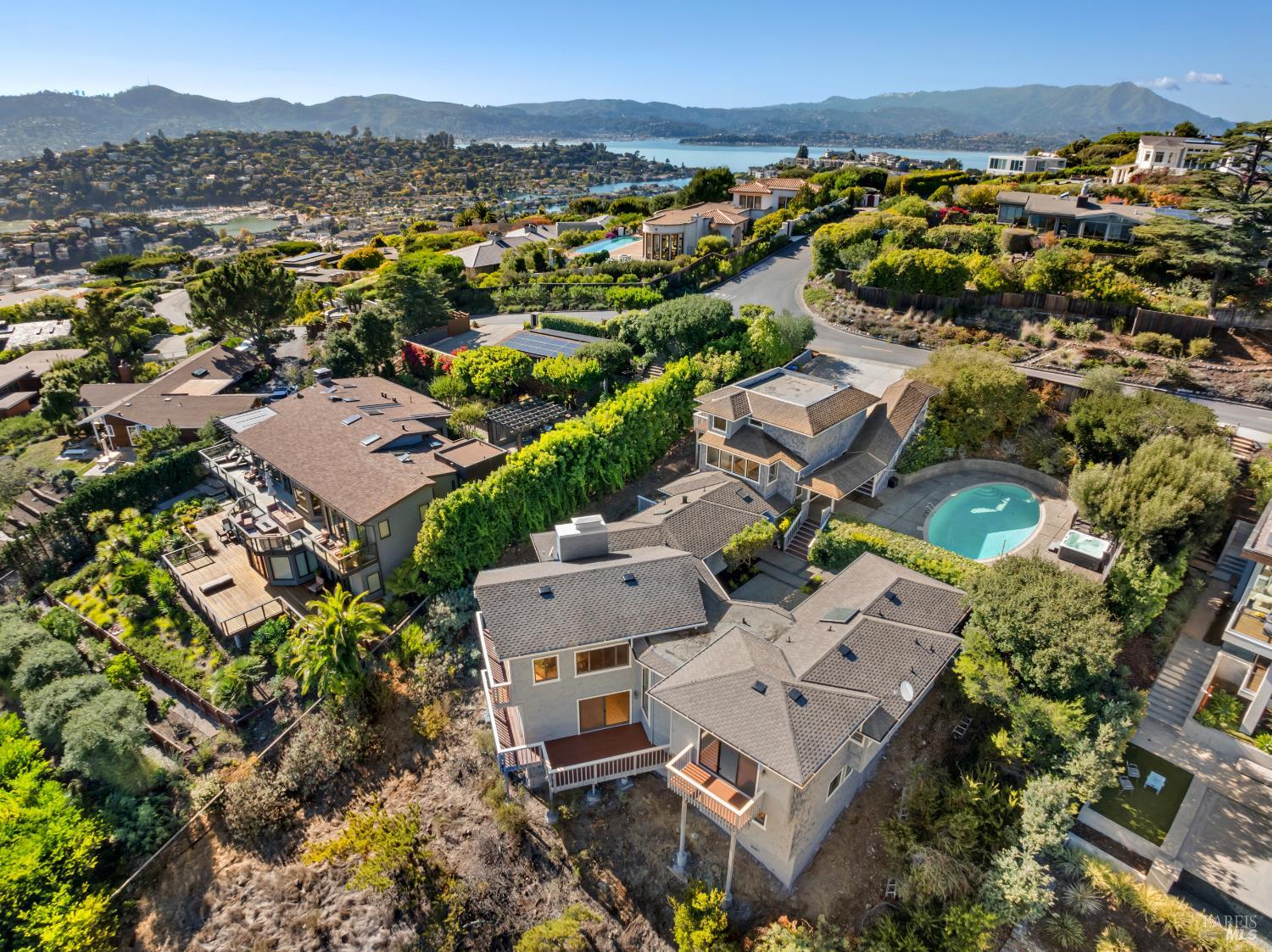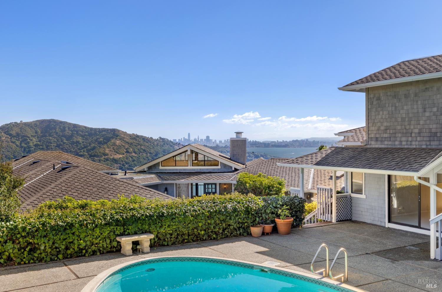 Experience ideal Tiburon living in this comfortable Hill Haven residence, offering sweeping views of Angel Island, the San Francisco skyline, and the Golden Gate Bridge. This elegant home features four ensuite bedrooms, including a private fourth suite + Office loft with separate access from the pool terraceideal for guests, extended family, or an office retreat. Outside, enjoy a sparkling pool and large spa, surrounded by sunny terrace. An elevator provides direct access from the street-level garage to the private fourth suite and then down to the main kitchen and family area, making grocery and luggage transport a breeze. The main level showcases an open-concept floor plan, seamlessly connecting the kitchen, family room, dining area, and generous living roomall oriented toward breathtaking Bay views. The primary suite and an additional ensuite bedroom are located on the same level, creating effortless, single level living potential. The lower level features a spacious second living room with a wet bar, opening out to a large deck areathe perfect setting for relaxed entertaining. This exceptional Tiburon home combines functionality with plenty of space to stretch out and world-class views in a coveted neighborhood.